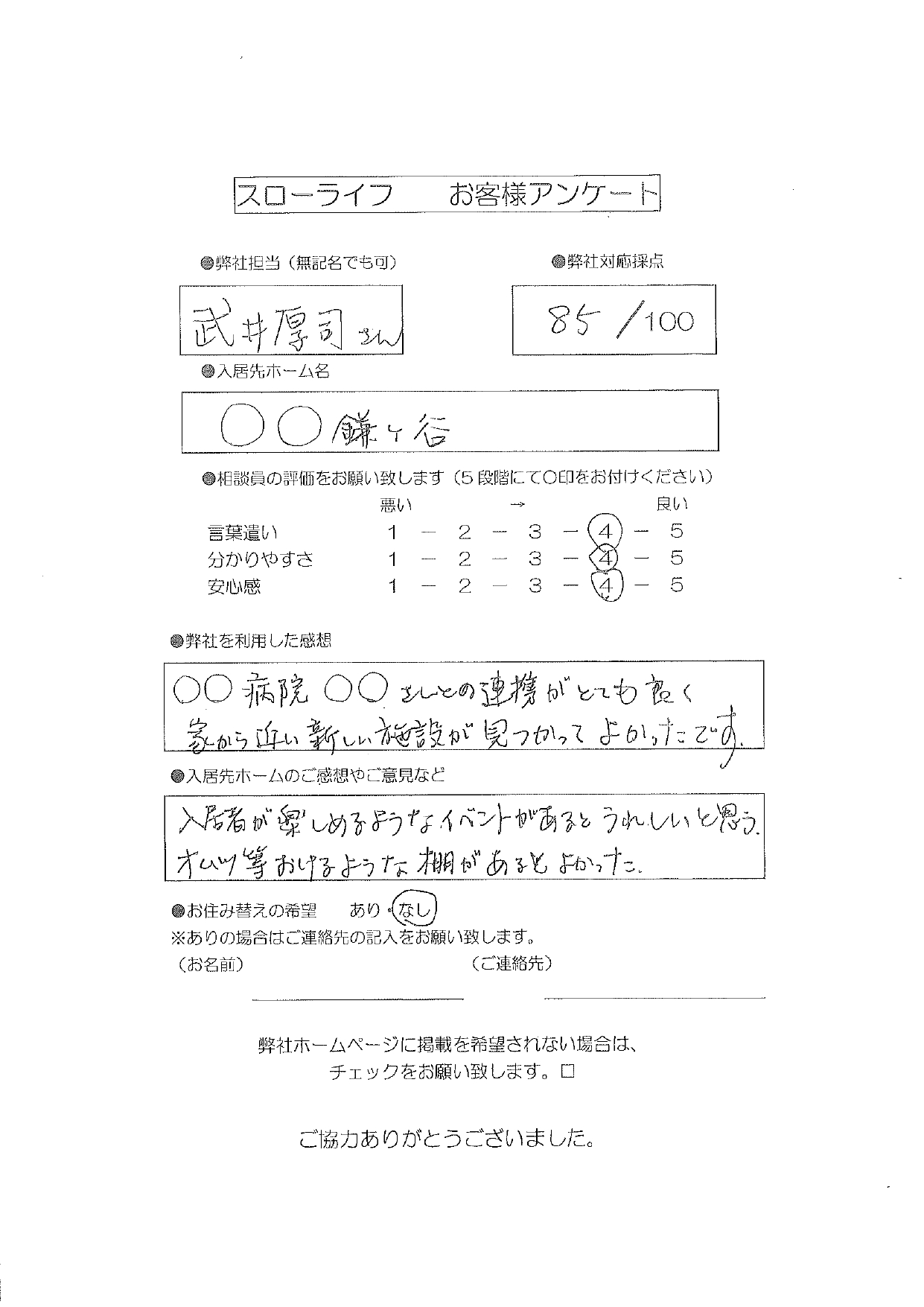 ○○病院○○さんとの連携がとても良く家から近い新しい施設が見つかってよかったです。