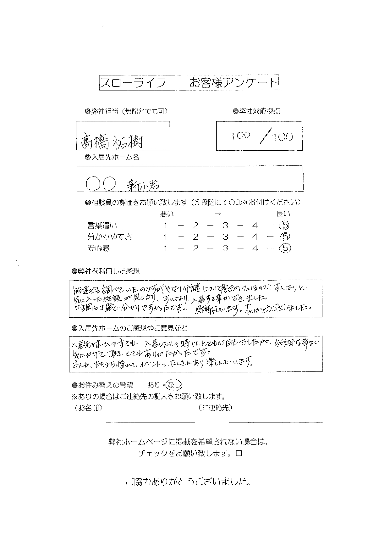 入居先のホームの方々も入居したての時は、とても心配でしたが些細な事まで気にかけて頂きとてもありがたかったです。本人もたちまち慣れてイベントもたくさんあり楽しんでいます。